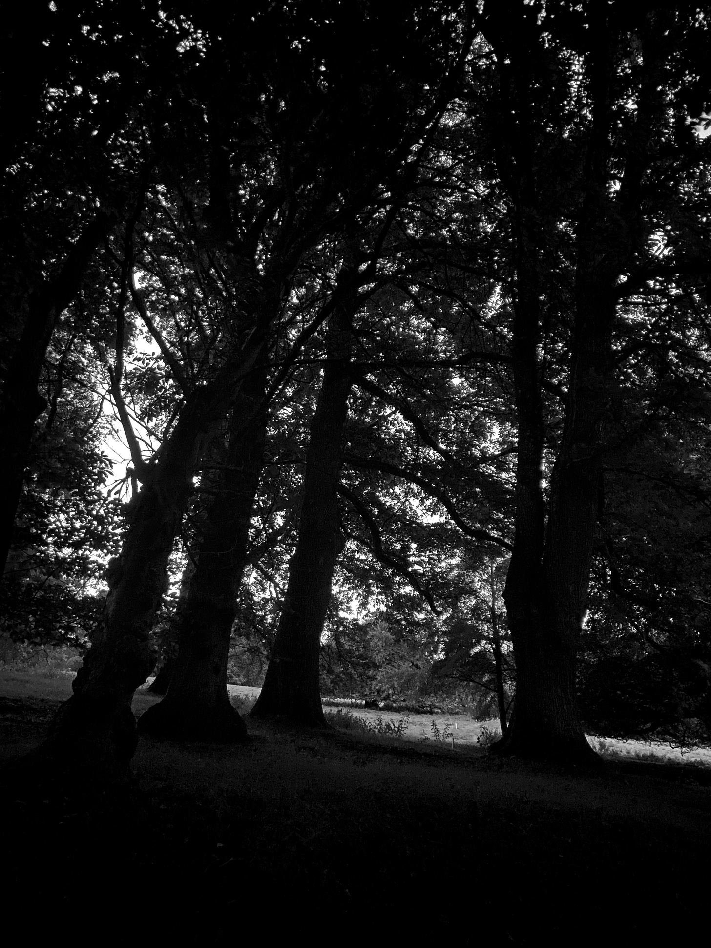 The first hard frost of the winter. Sun coming up behind the hills, sky burning. I’m walking the steep track through the woods up to the hill fort. As the light intensifies the fields in the distance begin to glow, like shrouds lit by flares. A flock of rooks rummaging noisily in a fallow field. Cows in their byres calling back in bass tones. The road frozen, the stream threading through the valley bright as a firework’s tail. All this glimpsed through a tangle of dormant oaks, hazels and rowans — blue-black stripes, wires, nets, spikes.